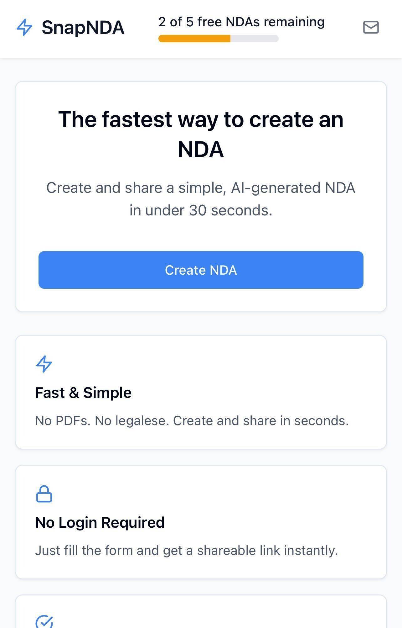 BITE 2 — The Docusign Killer Update on some app development: The progress is real. It is absolutely mind blowing what we’re capable of now that you can use AI to code. While I have a few apps going in the background, this one I think will be extremely useful. I’m calling it SnapNDA right now, but that domain is taken so it’s just a place holder. The concept is to be able to create, send and/or sign an NDA in 30sec, EASILY on your phone. Agreements shouldn’t be complicated and they should be accessible and ready to go whenever you need them. THIS is the solution. I’ll be looking for beta users fairly soon as we get this up and going and I’m sharing it with you first! Stay tuned for more as I roll this out.